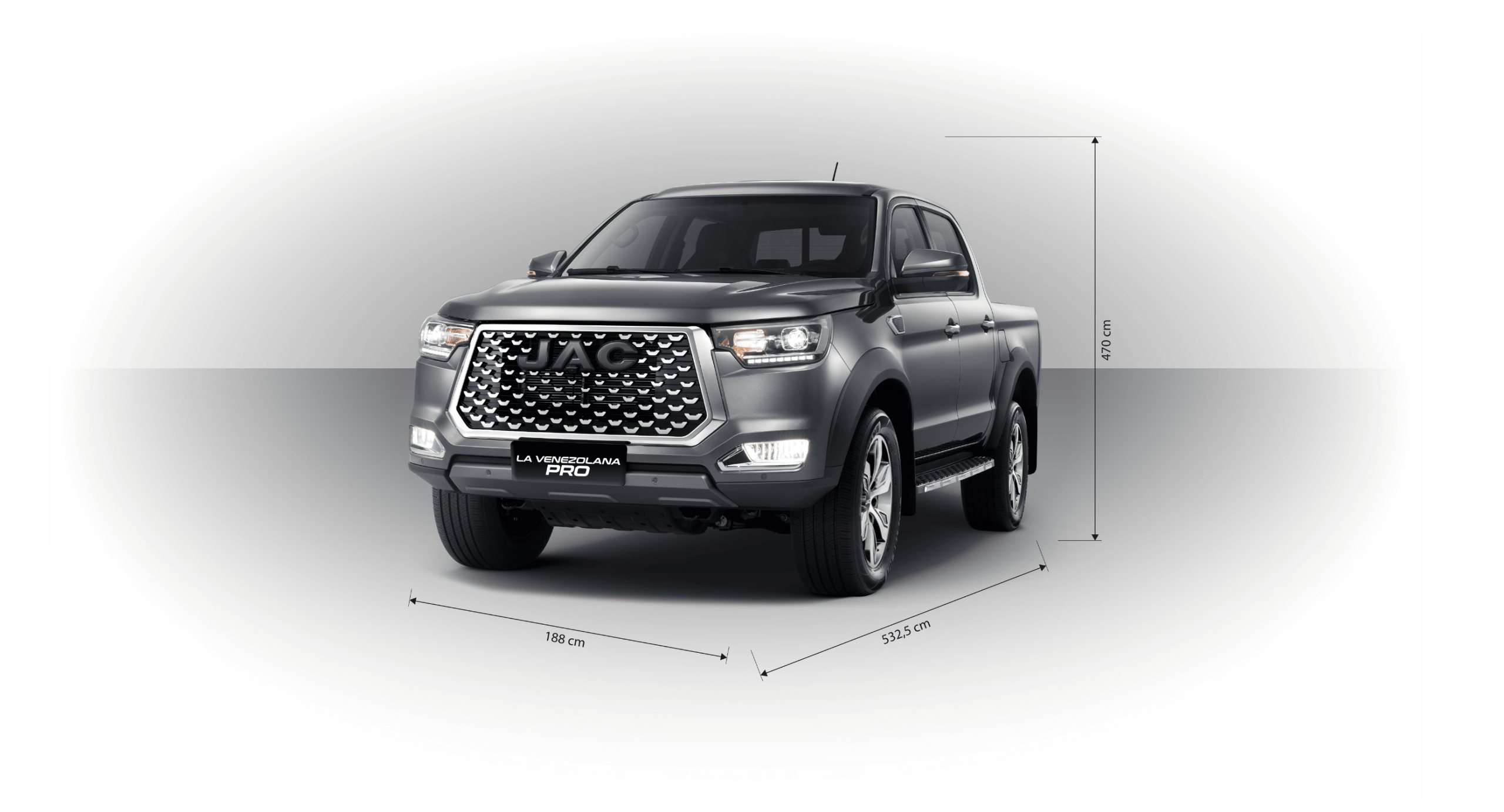 La JAC Venezolana Pro destaca por su apariencia firme y moderna, con proporciones que transmiten confianza en cada línea. Sus dimensiones de 5325 x 1880 x 1830 mm y sus rines de aluminio de 18” garantizan una presencia imponente, mientras su distancia mínima al suelo de 210 mm y su capacidad de carga de 900 kg la hacen ideal para trabajo, aventura y ciudad.